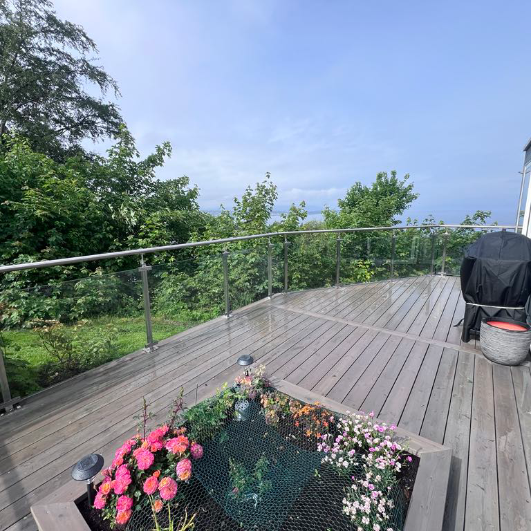 Rekkverk leveres med stål i syrefast A4 utførelse, og herdet og laminert kvalitetsglass.